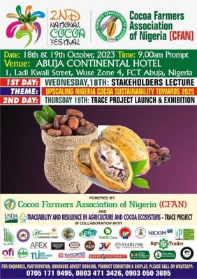 | Nigeria Cocoa stakeholders are currently preparing for the celebrations of the 2nd National Cocoa Festival slated for the 18th and 19th October,2023 at Abuja. |