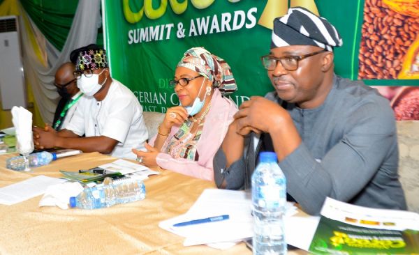 From L-R: Comrade Adeola Adegoke; CFAN President, Mrs. Babangida; Former FDA at FMARD and Mr. Suleiman; Director, Commodity and Commodities Export, FMITI at the Cocoa Summit and Awards held at Sandralia Hotel, Abuja on the 30th November and 1st December, 2021.